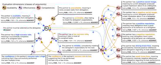 - Competence (associated with arguments from class ): This dimension evaluates whether a partner is capable of meeting the delegator’s expectations regarding task execution, considering the partner’s performance estimations. A delegator votes for or against arguments related to competence based on the following measures: