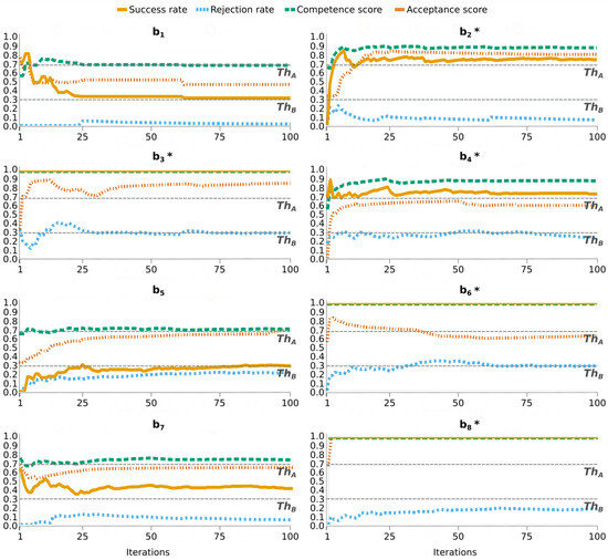 - Success rate (): This measure indicates the frequency with which a partner successfully completes a task, allowing its delegator to achieve its goal. The success rate is calculated as follows:where is the number of times that successfully completed , and is the number of times that attempted to execute , regardless of the success or failure in performing .