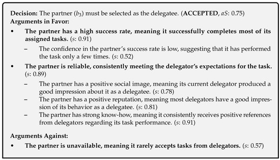 - Baqueta, J.J.; Tacla, C.A. Explaining Task Delegation Through Argumentation Debates with Votes. In Proceedings of the Ibero-American Conference on Artificial Intelligence, Montevideo, Uruguay, 16–15 November 2024; Springer: Berlin/Heidelberg, Germany, 2024; pp. 372–383. [Google Scholar]