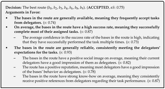 - Constructing the explanation (lines 8–14): After evaluating all supporting and opposing arguments, the algorithm constructs the explanation. The explanation consists of the decision (accepted or rejected) followed by a structured justification. If the answer argument meets or exceeds the threshold (), the explanation includes its acceptance and the supporting arguments that reinforce this decision. Otherwise, the argument is rejected, and the opposing arguments are included to justify the rejection.
