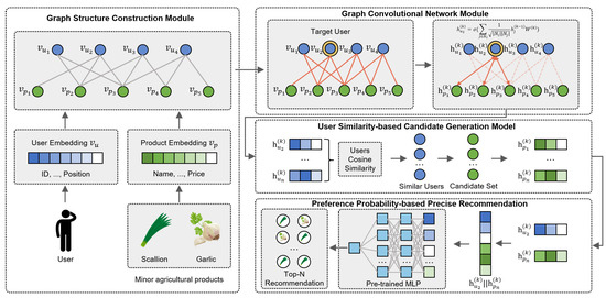 The proposed framework consists of four interconnected modules that operate sequentially in a pipeline architecture. The graph structure construction module integrates heterogeneous features from multiple sources, including user geographical locations, historical reviews, product nomenclature, and pricing information, to generate unified dimensional embeddings, thereby establishing a standardized data foundation for subsequent processing. The graph convolutional network module implements multi-layer convolutional architectures and message propagation mechanisms to extract deep feature representations of nodes, effectively mitigating the data sparsity challenge. The candidate set generation module employs cosine similarity metrics to identify preference correlations between users, facilitating the rapid construction of personalized candidate pools based on user similarity. The precise recommendation module utilizes a pre-trained multi-layer perceptron network to integrate user–product embedding vectors, generating personalized recommendation lists through sophisticated feature fusion. Specifically, the user similarity-based candidate generation model (USCG) and the preference probability-based precise recommendation model (PPPR) work synergistically, with USCG utilizing efficient cosine similarity methods to rapidly and cost-effectively compress the entire product catalog into a candidate set, performing efficient preliminary screening, enabling PPPR to conduct refined recommendations on a smaller-scale candidate set. This design approach addresses both the computational efficiency and high computational cost issues that may arise in large-scale data application scenarios while fully leveraging the feature vectors output by the graph convolutional network to ensure recommendation accuracy.