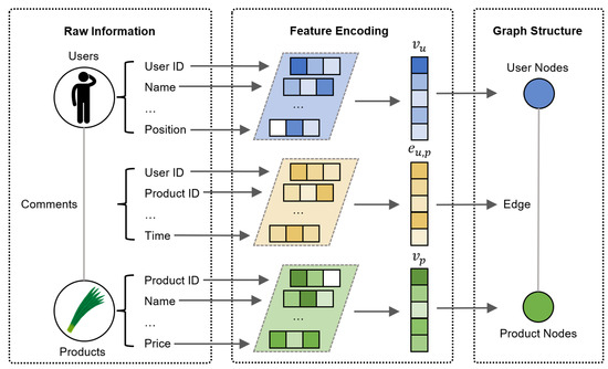 For a user node , the initial feature representation vector is constructed by incorporating multiple user attributes, including geographical location, historical behavioral patterns, etc. For a minor agricultural product node , the initial feature representation vector comprises fundamental product characteristics, such as the product’s name, store affiliation, and price information. Regarding edge features, we encode user–product interaction data, specifically ratings, timestamps, and review content, into the edge feature vector . As illustrated in Figure 2, our feature transformation framework systematically processes these heterogeneous information sources into a unified graph structure.