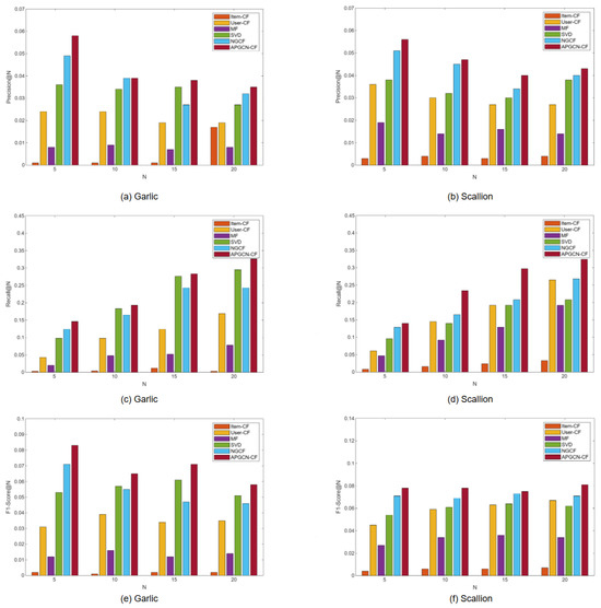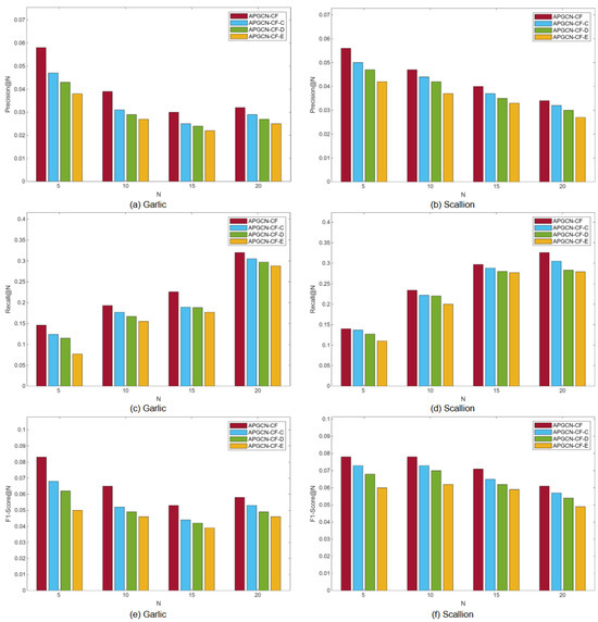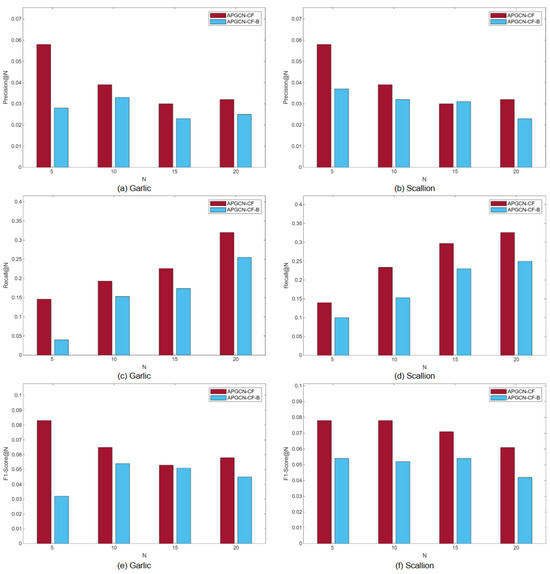 In this section, we present a systematic ablation study (Experiment 2) comparing the performance between APGCN-CF and its baseline variant APGCN-CF-B. The comparative analysis focuses on three key evaluation metrics: precision, recall, and F1-scores, assessed across two minor agricultural product datasets (garlic and scallion). Figure 4 presents a comprehensive performance comparison of the recommendation results, demonstrating the significant impact of integrating graph convolutional networks into the recommendation framework.