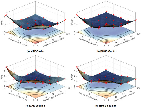 Figure 6 illustrates the impact of varying GCN layer depths and hidden layer dimensions on the model’s MAE and RMSE performance for the garlic and scallion datasets.