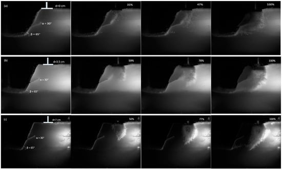 Process of shear band propagation with different setback distances of the footing. (a) d = 0 cm; (b) d = 3.5 cm; (c) d = 7 cm [].