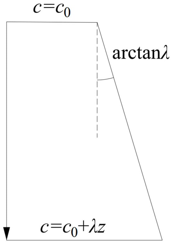 Due to different stress histories, depositional methods, and consolidation pressures, soils often exhibit non-homogeneous properties, and, in general, their non-homogeneity is mainly reflected in the depth direction. Different scholars have made different quantitative assumption models for the non-homogeneous characteristics of soils [,,,]. In this paper, the model based on the classical linear Mohr–Coulomb criterion is adopted, in which the cohesion of soils and the distance from the surface of soils tend to increase linearly, as shown in Figure 2. As the assumption is ideal and simple, it is more difficult to accurately reflect the real non-uniform properties of soils. However, the comparative analysis between the numerical results obtained in this paper and previously published data confirms the dependability of the computational methodology employed.