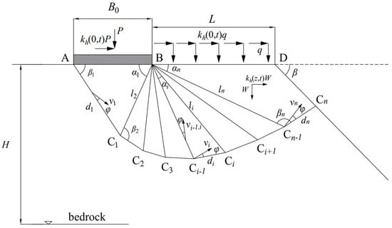 Based on the definition and formulation of the upper bound theorem, it can be found that the most critical step is to determine an accurate velocity-permissive motion field (failure mechanism), and the failure mechanism can reflect the real damage of the foundation more accurately. Therefore, based on the conclusions of previous studies (Soubra, 1999 []; Kang et al., 2024 []), the failure mechanism shown in Figure 3 is established in this paper. Since the effect of seismic action is considered in this paper, the damage pattern of the foundation is unilateral.