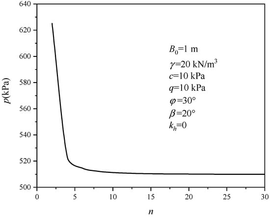 As presented above, n represents the number of wedge blocks. According to previous studies, when the number of wedge-shaped blocks is higher, the bottom rupture surface of the failure mechanism is smoother, and the calculated bearing capacity is more accurate. To take an appropriate value of n, this subsection carries out a convergence analysis of the foundation bearing capacity with respect to n, as shown in Figure 5. The specific values of the parameters are B0 = 1 m, γ = 20 kN/m3, c = 10 kPa, q = 10 kPa, φ = 30°, β = 20°, kh = 0, where seismic forces are not considered.