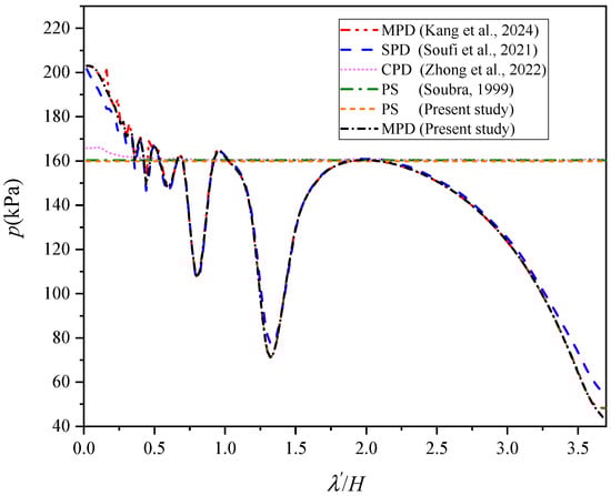 Based on the results of the previous section, it can be found that the results in the static case are very reliable, but the validity of the results when incorporating seismic forces into the limit analysis framework is still unknown; therefore, this section focuses on analyzing the seismic bearing capacity of foundations under different methods. Figure 6 shows the foundation bearing capacity calculated using different methods and the comparison with the existing literature results. It should be noted that the horizontal coordinate of Figure 6 represents the , where denotes the wavelength, which can be expressed as . Four different means of seismic force quantification are used in the results given in Figure 6, including the pseudo-static method (PS), the conventional pseudo-dynamic method (CPD), the spectral pseudo-dynamic method (SPD), and the modified pseudo-dynamic method (MPD). It should be emphasized that in order to compare the results with those of other studies, the seismic bearing capacity of strip foundations on horizontal ground is calculated in this section. It can be seen from Figure 6 that the results calculated in this paper using the MPD have the same trend and are closer to the results of Soufi et al. (2021) [] and Kang et al. (2024) []. Soufi et al. (2021) [] used the SPD to obtain the seismic bearing capacity, where the SPD is an improvement of the CPD to consider the . Kang et al. (2024) [] also used the MPD and therefore the results are very close to those of this paper, where the slight difference may be due to the different optimization algorithms used.
