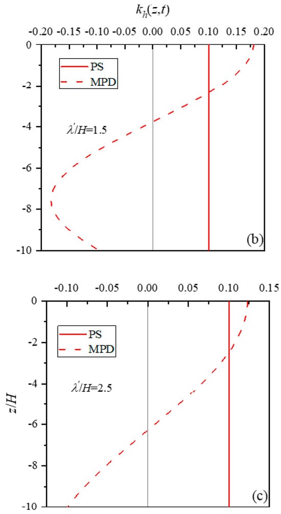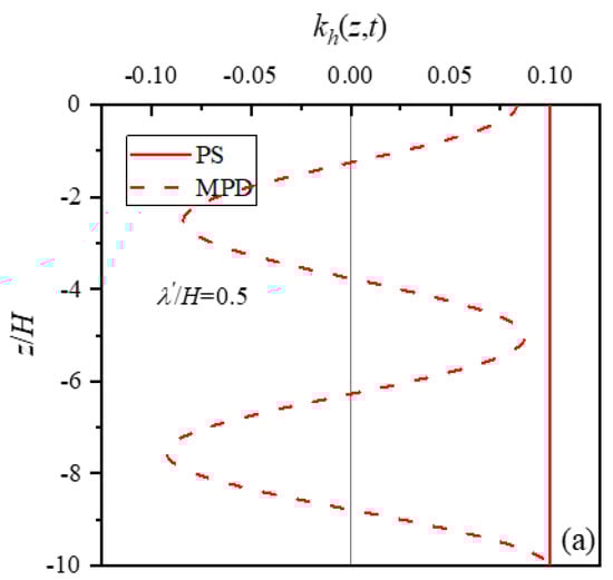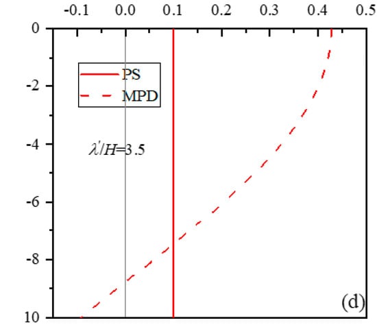 The depth profiles of the seismic acceleration coefficient for the PS and the MPD. (a) λ’/H = 0.5; (b) λ’/H = 1.5; (c) λ’/H = 2.5; (d) λ’/H = 3.5.