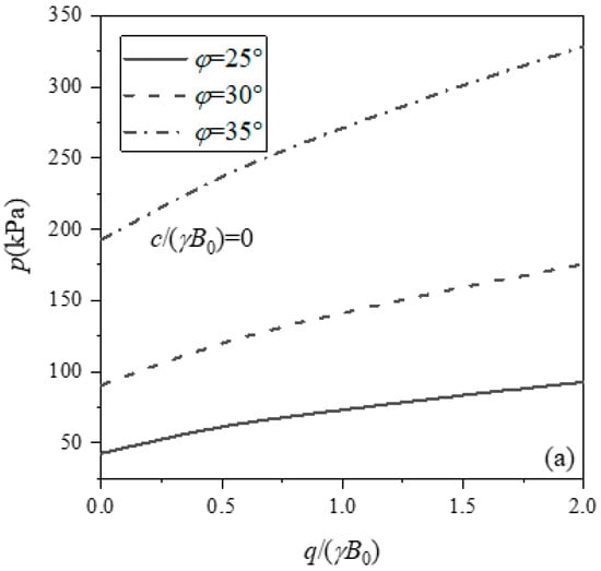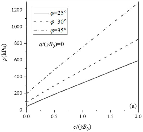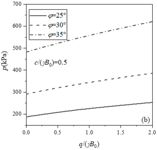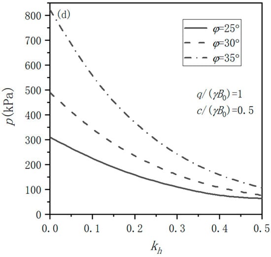 Figure 8 also shows the results of the seismic bearing capacity under four different combinations of and . It can be found that the uniform load and the cohesion have a significant effect on the bearing capacity. Therefore, in order to visualize the effect, the variation curves of the bearing capacity with the uniform load as well as the cohesion are given in Figure 8 and Figure 9, respectively.