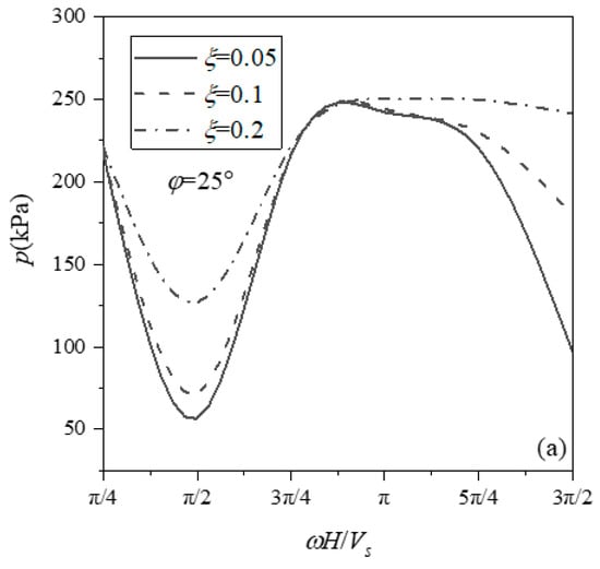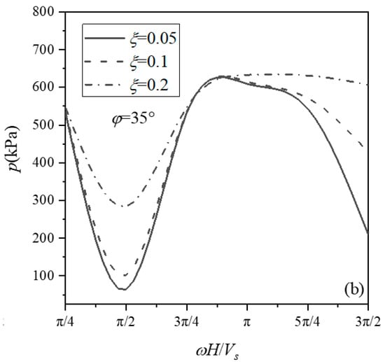 Figure 14 demonstrates the effect of normalized frequency and damping ratio on the seismic bearing capacity . There is a certain periodic pattern of the bearing capacity versus the normalized frequency , with a trough in the curve of the bearing capacity when and . For Figure 14a, when , the bearing capacity at is about 240% larger than that at . This indicates that for the seismic case, there is a most unfavorable situation for resonance to occur (). Moreover, for Figure 14a, when increases from 0.05 to 0.2 at , the bearing capacity increases by about 125%, whereas at , there is no significant change. Therefore, the effect of the damping ratio is different at different values of , and is most significant in the most unfavorable case.