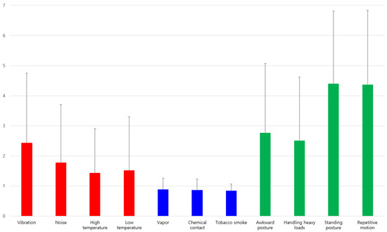 Mean of hazard exposure time (hours per day); red = physical hazards, blue = biochemical hazards, green = ergonomics hazards; error bars = standard deviation.
