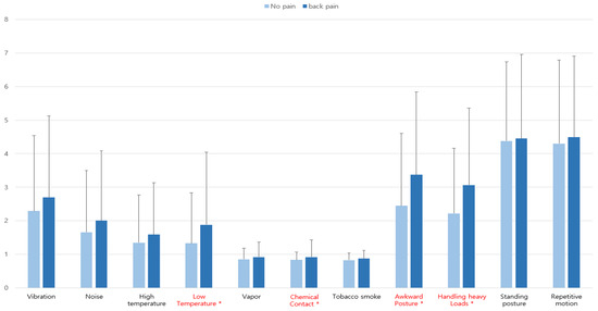 Figure 2 and Table 3 present the t-test results comparing daily hazard exposure between workers with back pain and those without. Among physical hazards, a significant difference was observed in the average daily exposure time between complainers and non-complainers only in the low-temperature environment (t = −3.155, p = 0.002). Specifically, the low-temperature exposure time for those complaining of back pain was 1.417 (1.882/1.328) times longer than that of those who did not complain. Among the biochemical hazards, there were significant differences in daily exposure times between groups, specifically regarding chemical contact (t = −2.199, p = 0.029) and tobacco smoke (t = −2.086, p = 0.038). Workers complaining of back pain were exposed to chemical contact 1.103 (0.923/0.837) times longer and to tobacco smoke 1.052 times longer than those who did not complain. In terms of ergonomic hazards, there was a significant difference between the groups regarding the daily exposure time to awkward posture (t = −4.546, p < 0.001) and handling heavy loads (t = −4.326, p < 0.001). Complainers experienced awkward posture 1.377 (3.371/2.448) times longer and handled heavy loads 1.380 times longer than non-complainers.