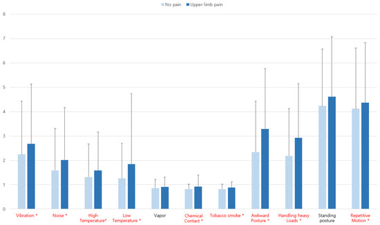 Figure 3 and Table 4 show the t-test results comparing daily hazard exposure between workers who complain of upper limb pain and those who do not. Regarding physical hazards, workers between groups show significant differences in their exposure times to vibration (t = −2.181, p = 0.030), noise (t = 2.553, p = 0.011), high temperature (t = −2.102, p = 0.036), and low temperature (t = −3.666, p < 0.001). Workers with upper limb pain experienced a daily exposure time that was 1.454 (1.838/1.264) times longer for low temperature, 1.270 times longer for noise, 1.204 times longer for high temperature, and 1.192 times longer for vibration than those without pain.