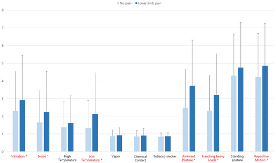 Mean exposure times (hours per day) for lower limb pain complaints. * Differences between groups exist at significance level of 0.05 (red letters); error bars = standard deviation.