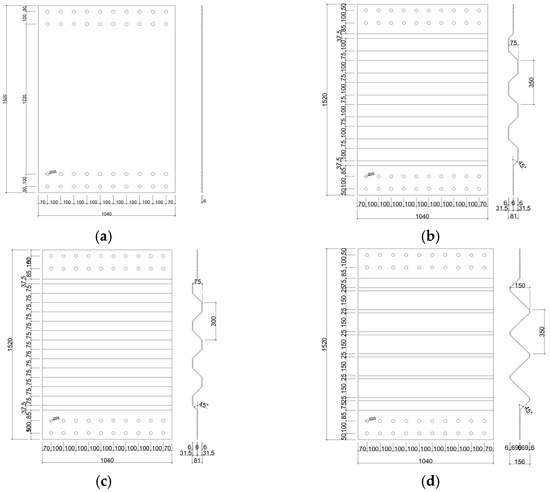 - TCSPSW-M-3: Trapezoidal corrugated plate (wave height = 150 mm, wavelength = 350 mm, Figure 1d).