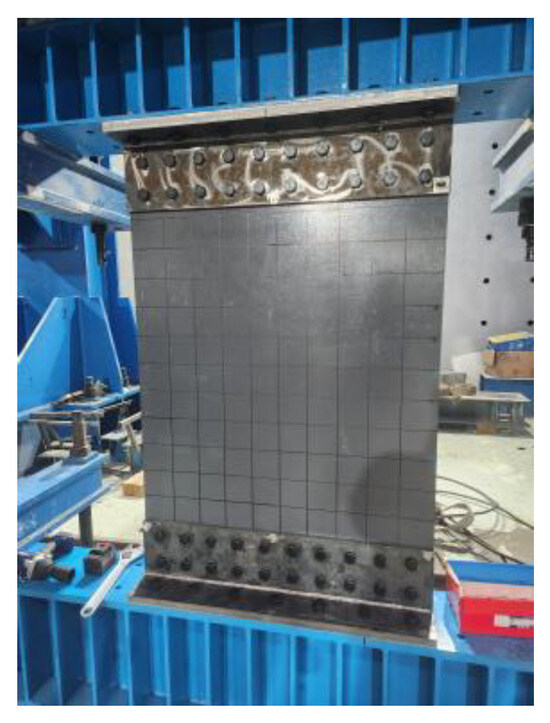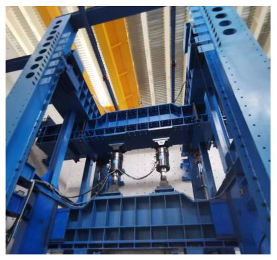 The experiment was conducted at the Civil Engineering Laboratory of Foshan University using a large-scale structural loading system (Figure 2). Specimens were bolted to a frame (Figure 3). The lateral MTS hydraulic servo actuator was connected to one end of the upper beam and the other end to the vertical reaction wall of the laboratory. It performs low-cycle reciprocating loading to simulate the effect of reciprocating seismic action. Since the upper part of the test setup has a significant self-weight, and the steel plate shear wall specimen does not bear excessive vertical loads in actual engineering, a vertical MTS hydraulic servo actuator is required to apply a load equivalent to its own weight to the steel beam connected to the upper part of the steel plate during the loading process. This ensures that the upper beam remains horizontal at all times so that the specimen is not subjected to any weight other than that of the beam, the T-shaped transfer beam, and itself. As a result, the deformations and mechanical properties of the precast corrugated steel plate shear wall under seismic action can be accurately reflected.