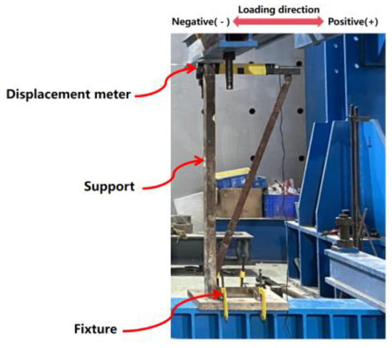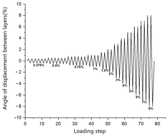 The loading system is shown in Figure 7. A hydraulic servo system is used to apply low-cycle reciprocating loads. A displacement—controlled loading method with varying amplitudes is adopted: Specifically, six loading cycles are first conducted using displacement loads corresponding to inter-story drift angles of 0.375%, 0.5%, and 0.75%, respectively. Then, four loading cycles are carried out using displacement loads corresponding to an inter-story drift angle of 1%. Finally, two loading cycles are performed using displacement loads corresponding to inter-story drift angles of 1.5%, 2%, 3%, 4%, 5%, 6%, 7%, and 8%, respectively.