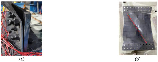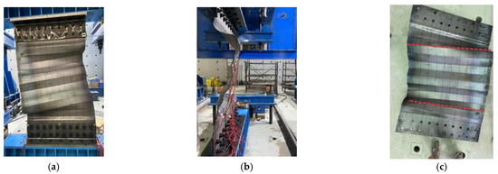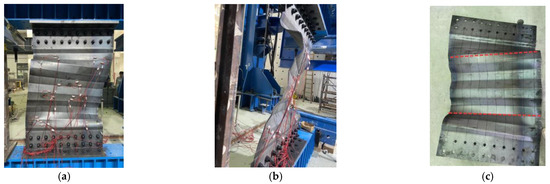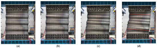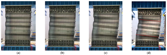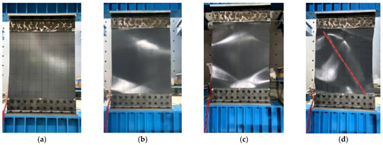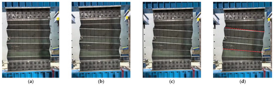 As shown in Figure 14, the deformation diagrams of the TCSPSW-M-3 specimen under different loading inter-story drift angles can be seen. Before the loading reached ∆ = +2%, there was no significant deformation of the TCSPSW-M-3 specimen (Figure 14a). When the loading reached ∆ = +4%, the steel plate of the TCSPSW-M-3 specimen began to deform in a regular “accordion-like” pattern due to the changes and misalignment of the displacements of the upper and lower connecting plates. As the loading inter-story drift angle increased, this regular deformation became more evident. However, throughout the entire process, no significant buckling or out-of-plane deformation was found (Figure 15).