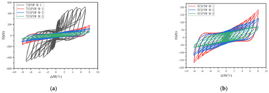 Comparison of hysteresis curves of each specimen: (a) Hysteresis curve of each specimen, (b) Hysteresis curve of each specimen (except TSPSW-M-1).