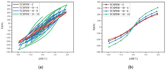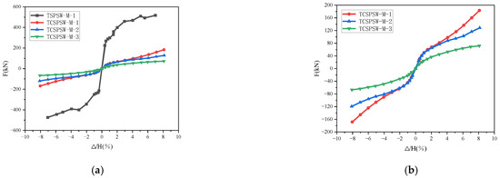 The hysteresis curves of TSPSW-M-1, TCSPSW-M-1, TCSPSW-M-2, and TCSPSW-M-3 are shown in Figure 16. The hysteresis curve of TSPSW-M-1 obtained from the test presents a “bow-shaped” form. The curve is relatively full, but it has a pinching effect. This indicates that the plastic deformation capacity of the entire structure or specimen is relatively strong, and the performance in the low-cycle repeated load test of the node is good, which enables it to absorb seismic energy effectively. The hysteretic curves of TCSPSW-M-1 and TCSPSW-M-2 specimens are approximately “anti-S-shaped”. Compared with the bow section, the hysteretic curves have longer sliding sections, reflecting more sliding effects, and the area surrounded by the curves is reduced, which reflects the ductility of the specimens and the ability to absorb seismic energy are poor. The hysteresis curve of the TCSPSW-M-3 specimen is approximately “diamond-shaped”, which is symmetric and full. It can intuitively reflect that the plastic deformation capacity of the entire structure or specimen is very strong, and it has excellent seismic performance and energy dissipation capacity.
