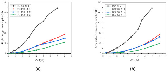 Figure 19a presents the energy dissipation curves for the first cycle of each loading stage of the four specimens (single-cycle energy dissipation curves). It can be seen that the single-cycle energy dissipation of the TSPSW-M-1 specimen (flat steel plate shear wall) is much higher than that of the other three specimens. Before the loading reached 4%, the single-cycle energy dissipation of the TCSPSW-M-1 and TCSPSW-M-2 specimens was almost equal. As the loading continued, the single-cycle energy dissipation of the TCSPSW-M-1 specimen began to be slightly higher than that of the TCSPSW-M-2 specimen. Throughout the entire loading process, the single-cycle energy dissipation of the TCSPSW-M-3 specimen was the lowest among the three specimens. This indicates that the flat steel plate shear wall has a stronger energy dissipation capacity in a single loading cycle. The TCSPSW-M-1 specimen has a higher energy dissipation capacity than the TCSPSW-M-2 specimen under higher loads, while the single-cycle energy dissipation of the TCSPSW-M-3 specimen is the lowest throughout the loading process, indicating its weaker energy dissipation capacity.