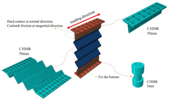 The corresponding contact of each component in the model is set by ABAOUS under the interacting plate, in which the pressure mode is set as “hard contact” in the normal behavior, the friction formula is set as “penalty” function in the tangential behavior, the slip formula is limited slip, and the friction coefficient is set as 0.35.