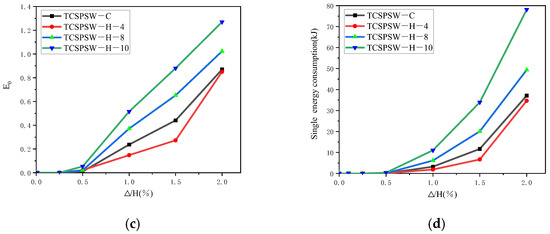 Figure 25 shows the results of the finite element simulation calculations carried out using the four models from Table 3, TSCSPSW-C, TCSPSW-Ph-50, TCSPSW-Ph-100, and TCSPSW-Ph-150, with corrugation heights of 50 mm, 75 mm, 100 mm, and 150 mm, respectively. As the corrugation heights of the models TSCSPSW-C, TCSPSW-Ph-50, TCSPSW-Ph-100, and TCSPSW-Ph-150 increase progressively, the energy dissipation of the models decreases. This is because increasing the corrugation height actually reduces the lateral load-bearing capacity of the corrugated steel plates, thereby reducing the energy dissipation of the models. As the corrugation height increases, the loading stage at which the models enter the elastoplastic stage is also delayed. It can be seen that before the stage of ∆/H = 1.5%, the energy dissipation coefficient (E0) of the four models is negatively correlated with the corrugation height. At the stage of ∆/H = 2.0%, the E0 of the steel plate model with a corrugation height of 150 mm (TCSPSW-Ph-150) exceeded that of the steel plate model with a corrugation height of 50 mm (TCSPSW-Ph-50), with a value of 1.25, which was 43.61% higher than that of the model with the lowest E0 (TSCSPSW-C). In terms of energy dissipation, the steel plate model with a corrugation height of 50 mm (TCSPSW-Ph-50) had the highest energy dissipation at the stage of ∆/H = 2.0%, reaching 69.44 kJ, which was 150.6% more than that of the model with the lowest energy dissipation (TCSPSW-Ph-150). It can be seen that the corrugation height has a significant impact on the energy dissipation capacity of the corrugated steel plate shear walls.