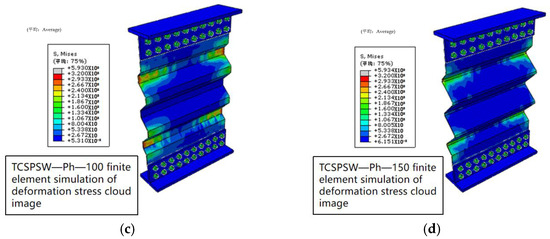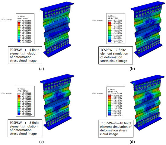 Stress comparison diagram of different plate thickness models: (a) TCSPSW—t—4, (b) TCSPSW—C, (c) TCSPSW—t—8, (d) TCSPSW—t—10.