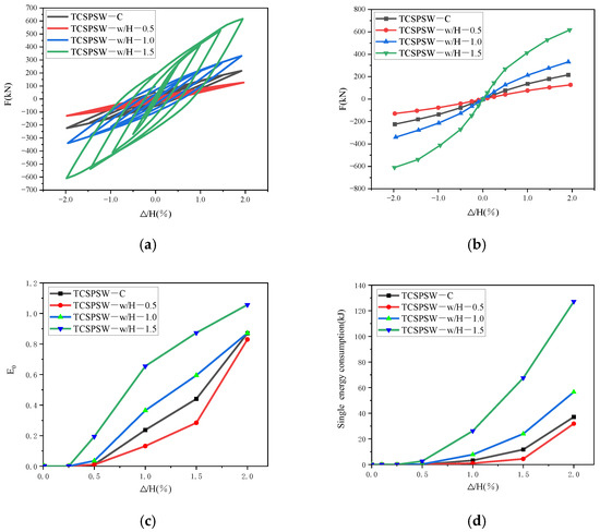 As shown in Figure 23, finite element simulations were conducted using the four models from Table 3, TSCSPSW-C, TCSPSW-w/H-0.5, TCSPSW-w/H-1.0, and TCSPSW-w/H-1.5, with width/height ratios of 0.5, 0.68, 1.0, and 1.5, respectively. Compared to the other three models, the E0 of the TCSPSW-w/H-1.5 model began to increase at the stage of ∆/H = 0.25%, indicating that the model gradually entered the elastoplastic stage and started to dissipate energy (although the amount of energy dissipation was relatively small). The loading stage at which the other three models entered the elastoplastic stage also advanced with the increase in the width/height ratio. The width/height ratios of the models TSCSPSW-C, TCSPSW-w/H-0.5, TCSPSW-w/H-1.0, and TCSPSW-w/H-1.5 increased progressively, and, correspondingly, the energy dissipation coefficients (E0) and energy dissipation of the models also increased to varying degrees. This shows that the energy dissipation efficiency and the amount of energy dissipation of the models increase with the increase in the steel plate width/height ratio, showing a positive correlation. At the stage of ∆/H = 2.0%, the E0 of the steel plate model with a width/height ratio of 1.5 (TCSPSW-w/H-1.5) was the highest, at 1.06, which was 27.37% higher than that of the model with the lowest E0 (TCSPSW-w/H-0.5). The energy dissipation of the steel plate model with a width/height ratio of 1.5 (TCSPSW-w/H-1.5) was the highest at the stage of ∆/H = 2.0%, reaching 127.15 kJ, which was 299.99% more than that of the model with the lowest energy dissipation (TCSPSW-w/H-0.5). It can be seen that the width/height ratio of the steel plate has a very significant impact on the energy dissipation capacity of the models.