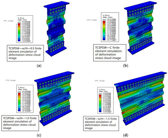 Stress comparison diagram of different board width models: (a) TCSPSW—w/H—0.5, (b) TCSPSW—C, (c) TCSPSW—w/H—1.0, (d) TCSPSW—w/H—1.5.