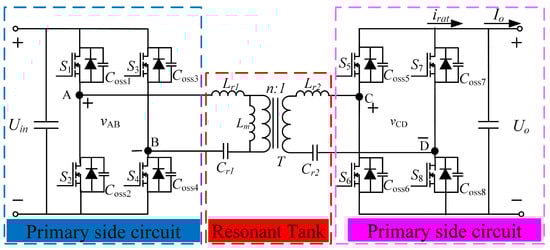 The topology of the CLLC resonant converter is shown in Figure 1. It consists of two H-bridge circuits on the primary and secondary sides; the primary-side switching devices are denoted as , and the secondary-side switching devices are denoted as . The resonant tank is symmetrically distributed, and the resonant tank comprises resonant capacitors , , resonant inductors , magnetizing inductors , and a transformer. The parameters of the resonant tank are designed symmetrically, following the specific relationship equations , . For simplicity, parasitic parameters are neglected in the subsequent modeling process.