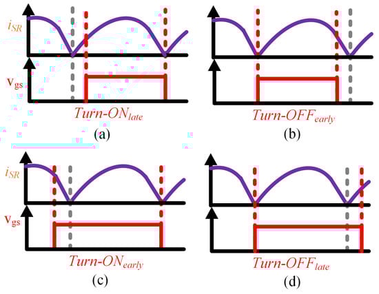 In the driving of SR, several main issues arise: turning on too early or too late, and turning off too early or too late. As shown in Figure 2a,b, the late turn-on or early turn-off of the rectifier’s signal will cause the current on the secondary side to pass through the body diode of the MOSFET. While this does not affect the operation of the resonant converter, it results in additional conduction losses and reduced efficiency. As shown in Figure 2c,d, if the rectifier signal turns on early or turns off late, the load will be discharged, causing the output current to flow back to the rectifier in the reverse direction. This leads to energy transfer from the secondary side to the primary side, resulting in a large circulating current. As the circulating current continues to increase, the primary-side circuit may be damaged.