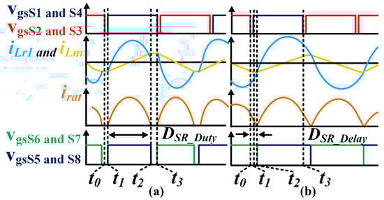 Figure 3a shows the waveforms of the resonant converter operating in below-resonance mode, which is referred to as PO mode [25] in the literature. The time denotes the dead time of the MOSFET, and the optimal turn-on time of the synchronous rectifier gate signal is and the optimal turn-off time of the synchronous rectifier gate signal is . The primary resonant inductor current and the magnetizing inductor current are equal during .