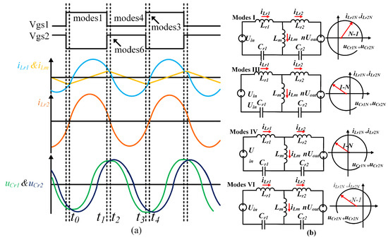 Key waveforms and corresponding trajectories of the CLLC resonant converter. (a) Key waveforms in the below-resonant region. (b) Equivalent circuit corresponding to the state plane trajectory.