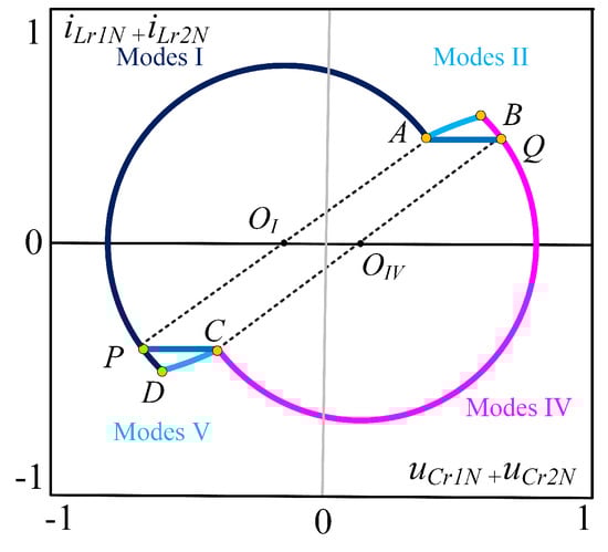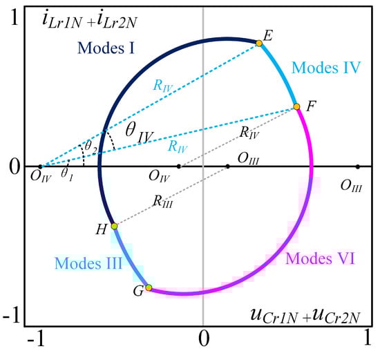 In Equation (9), in which and correspond to the sum of the resonant capacitor voltages for modes E, F, and H, and ,, and correspond to the sum of the resonant capacitor currents for modes E, F, and H, is the radius of the mode 1 trajectory, and is the radius of the trajectory of mode 4.