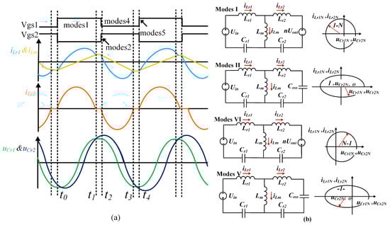 There are four modes in the below-resonant state: mode 1, mode 2, mode 4, and mode 5. As shown in Figure 6a, the key waveforms corresponding to these modes are illustrated, while Figure 6b presents the trajectory diagrams and equivalent circuits for the four modes.