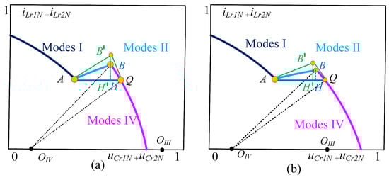 Since is parallel to the x-axis, the difference between point and is equal to the center distance between mode 1 and mode 4, and b denotes the voltage difference between the AB segments. From Equations (18) and (19), we can obtain the coordinates of the circle centers of mode 1 and mode 4: mode 1 center , and mode 4 center , and the voltage difference is equal to the horizontal distance between the center of the circle, which is therefore obtained as follows:
