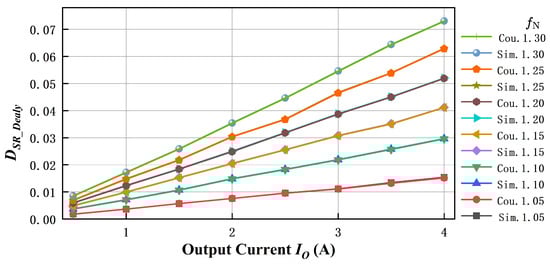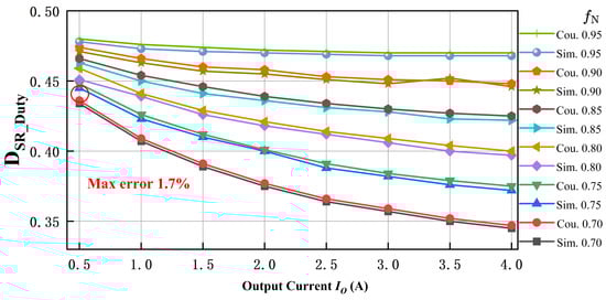As shown in Figure 11, the delay duty cycle calculation results of the proposed synchronous rectification method are compared with the simulation results. It can be observed that the proposed calculation results exhibit high accuracy, with only a minor error between the calculated and simulated values.