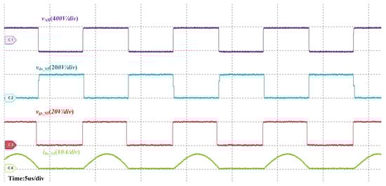 Figure 14 shows the main waveforms of the converter at an input voltage of 200 V and an output voltage of 200 V, operating at the resonance point. As can be seen from the figure, the synchronous rectifier signal is consistent with the ideal conduction state. There is no premature shutdown or advance conduction of the rectifier, which proves the accuracy and effectiveness of the present method at the resonance point.