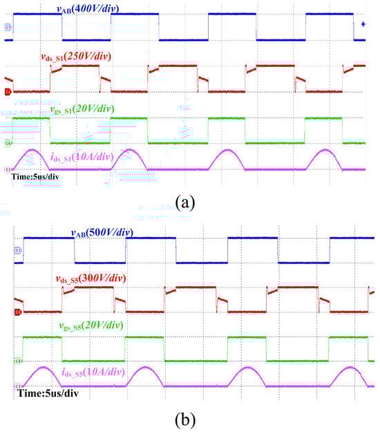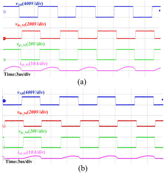 Figure 16a presents the key waveforms of the converter in under-resonant mode during forward operation with an input voltage of 200 V and an output voltage of 160 V. Figure 16b shows the key waveforms of reverse operation in under-resonant mode, with an input voltage of 160 V and an output voltage of 130 V. From the above waveforms, it can be observed that the synchronous rectifier signal aligns with the ideal conduction state. There is no instance of the rectifier tube shutting down prematurely or conducting ahead of time, which confirms the accuracy of the proposed method.