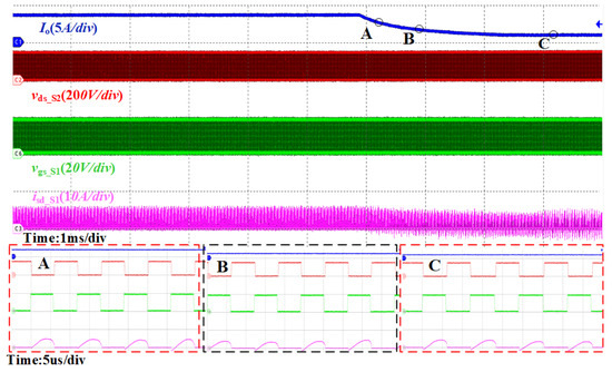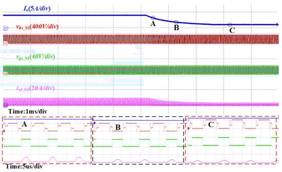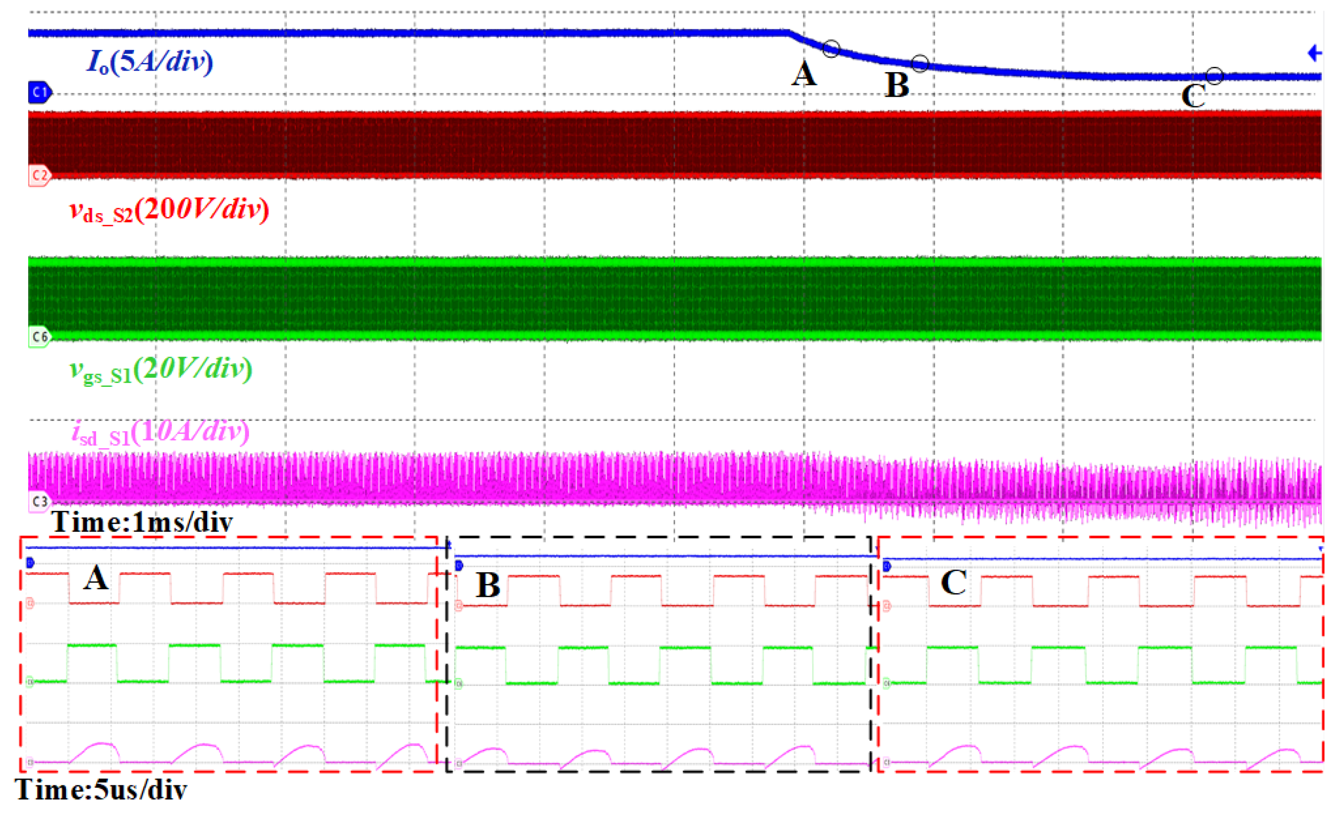 CLLC resonant converter under-resonant state switching load SR waveform, input voltage 200 V, output voltage 250 V, output current 4 A switching to 1 A. (A–C) are enlarged diagrams of the corresponding points.