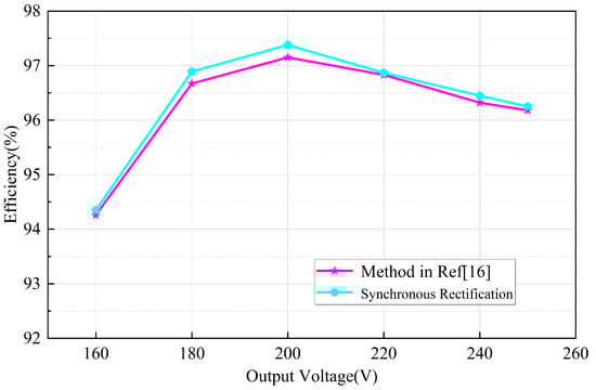 The efficiency of the synchronous finishing scheme proposed in this paper is compared with the SR scheme in [16] at different output voltages for rated power.