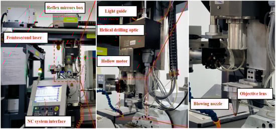 Ultra-short-pulse lasers, especially femtosecond lasers, can effectively overcome the above-mentioned defects of long-pulse lasers and are gradually becoming an ideal tool that can perform high-quality microprocessing for various materials. Due to the extremely short pulse width and high peak power, the thermal diffusion phenomenon is less obvious. The majority of the material is removed by gasification, which can effectively reduce defects such as recast layers, micro-cracks, and surface splashing, thereby achieving better processing quality [17,18]. Lots of research work has focused on the interaction mechanism between femtosecond lasers and processed materials [18,19,20,21], but the methods they used mainly include pecking drilling or scanning drilling by two-dimensional galvanometers. However, because of the shielding effect of the pore wall and the lack of laser incident angle adjustment function, the above-mentioned methods can produce obvious tapering of micro-holes, which prohibits the application of such methods in blade component processing.