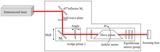 The experimental platform is a five-axis CNC machine tool equipped with a femtosecond laser, a reflector box, and the helical drilling optical system from Fraunhofer Institute for Laser Technology, as shown in Figure 1. The helical drilling optical system mainly consists of the reflector M1, half-wave plate, wedge-shaped prism, hollow motor, Dove prism, balance mirror groups, and focusing lens. The internal beam propagation path is shown in Figure 2. The wedge-shaped prisms 1 can adjust the diameter of the micro-hole by deflection, and the mirror M2 can control the taper of the micro-hole by translation, based on the adjustment of laser incident angle and position. The Dove prism installed in the hollow motor can make the laser beam move in a circular motion around the center of the micro-hole. The optical aperture of the helical drilling system is about 25 mm.