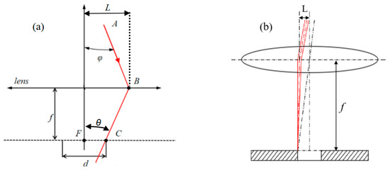 The mirror M2 is fixed on a one-dimensional linear moving platform, which determines the shift distance L of the laser incoming on the surface of the objective lens. The wedge prism is installed on a rotating motor, named the hollow motor, and its deflection angle determines the angle at which the laser is incident on the surface of the objective lens. The calculation principle is shown in Figure 3a.