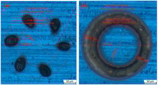 The error of the helical drilling system is mainly composed of light spot shape error and mechanical rotation error. The laser light spot is not circular after being focused by the objective lens but is an approximate ellipse, as shown in Figure 5a. As the Dove prism rotates, the light spot also rotates, at twice the speed of the prism. The pore wall of the processed hole is not always cut by the same position of the light spot circumference. Therefore, the roundness error of the light spot shape will be reflected on the roundness error of the processed hole. The spot shape error is mainly caused by the quality of the laser beam and the lens light. At the same time, the light spot shape is also not consistent at different positions along the cutting trajectory, and this difference can also affect the roundness error of the processed hole. As shown in Figure 5a, there is an obvious difference in the shape of the light spot at 0° and 180° positions. The latter is significantly larger than the former. This will cause a change in the width of the cutting path when the light spot rotates, as shown in Figure 5b. The left cutting path is significantly wider than the right cutting path. The more irregular the shape of the spot, the greater the roundness error. The errors above, combined with the rotational errors of the mechanical system, will ultimately affect the roundness error of the processed hole. According to the width variation of the cutting path in Figure 5b, theoretically, if all materials on the cutting path are removed, the roundness error is about 7 µm. However, because the size of the spot in Figure 5 includes a large heat-affected zone, the actual roundness error will be less than 7 µm, if only the focus spot size or Rayleigh length range is considered. The size of the heat-affected zone is around 50 µm. Observing the completely burned-through area of the material in a single spot in Figure 5a, the diameter of the focus spot in this system is about 20–25 µm; this is consistent with the theoretical value mentioned in Section 2. If the ablation threshold of the material is considered, and the material is strictly removed just at the focal point, the final hole roundness error is about 3~5 µm in our helical drilling system. Good dynamic balance is an effective way to overcome spot rotational errors when the helical drilling system leaves the factory.