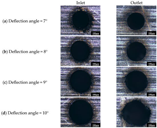 When the laser power and repetition frequency are constant, namely, the laser parameters are fixed, the influence of the helical drilling system parameters on the inlet morphology of the micro-hole is as shown in Figure 6. As shown in Figure 6, the inlet diameter gradually increases as the deflection angle of the wedge prism increases, but it is not a linear relationship. This is consistent with the helical drilling principle introduced in Section 2. In fact, the diameter of the hole inlet is also related to another factor, which is the distance at which the focus spot moves down during the drilling process. In order to completely cut off the material at the outlet of the micro-hole on the thick plate, the focus spot must be lowered to the position approximately one Rayleigh length from the outlet. When the focus spot shifts downwards, the size of the hole inlet will increase, and the increase extent is related to the axial light intensity distribution of the Gaussian spot. In order to study the effects of helical drilling system parameters on the size of the micro-hole, the downward distance of the focus spot was set as 0.43 mm, according to the thickness of the processed plate and the Rayleigh length of the laser.