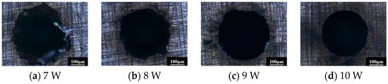 To verify the effect of instantaneous power density on outlet morphology, the rotation speed of the hollow motor was fixed, and the laser power was changed. Of course, the spot overlap was also fixed under these experimental conditions. The results are shown in Figure 8. As the laser power decreases, the instantaneous power density decreases accordingly, the outlet edge gradually becomes irregular, the roundness deteriorates, and large areas of material not removed appear at the edge of the outlet. When the laser power increases, the outlet edge quality is significantly improved. Thus, the important influence of instantaneous power density on the outlet morphology was verified.